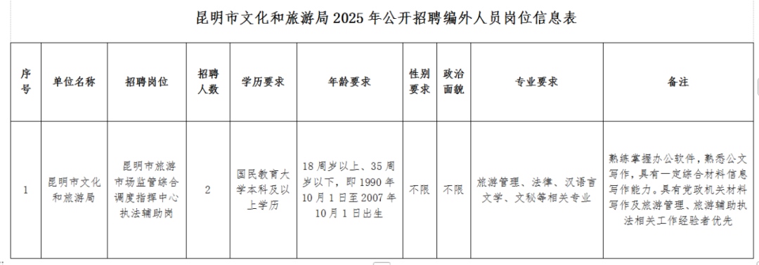 本次共招聘2人。岗位详见附件1.《昆明市文化和旅游局2025年公开招聘编外人员岗位信息表》。