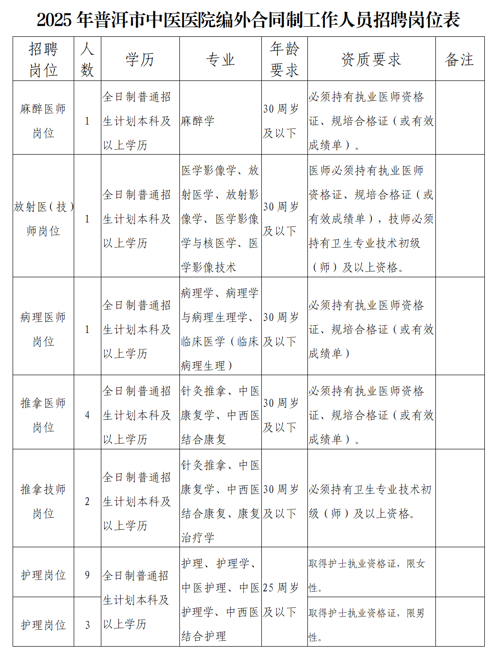 普洱市中医医院2025年公开招聘编外合同制工作人员公告