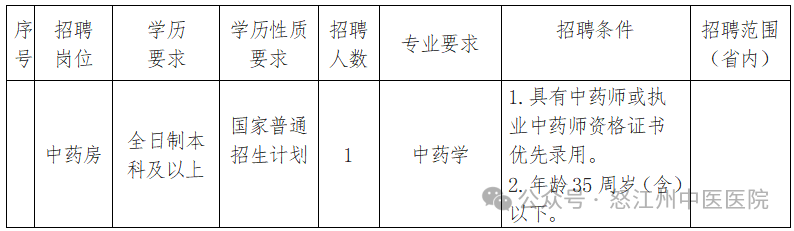 中药房岗位:全日制本科及以上学历,取得毕业证书、学位证(具有中药师或执业中药师资格证书优先录用)。