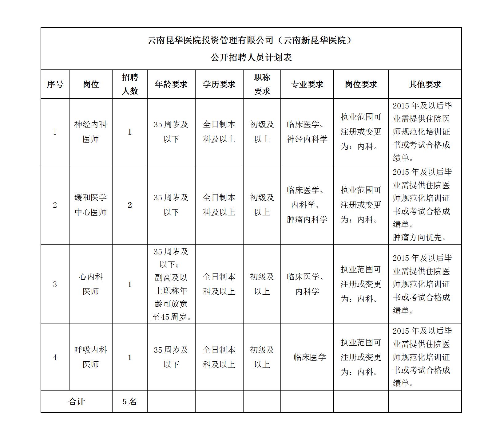 云南昆华医院投资管理有限公司(云南新昆华医院)本次公开招聘4个岗位,共招聘工作人员5名,具体详见下表: