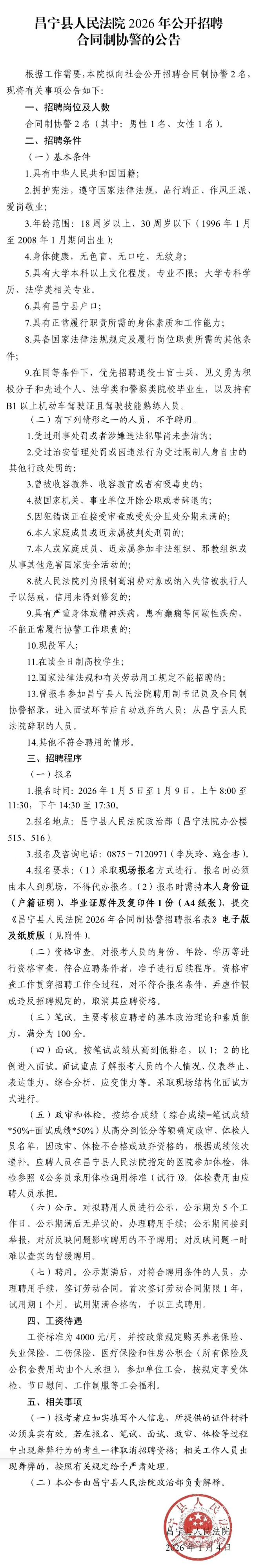 昌宁县人民法院2026年公开招聘合同制协警的公告